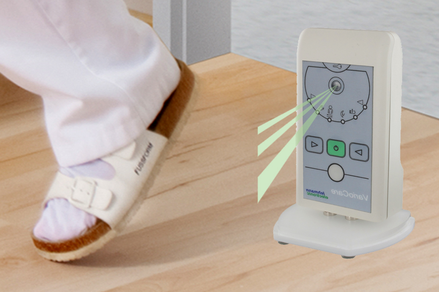 Über einen optionalen Fußtaster kann am Sensor - ohne sich bücken zu müssen - und auch mit vollen Händen die Pflegezeit aktiviert werden. Während der Pflegezeit ist der Sensor inaktiv und löst keine Alarme aus.