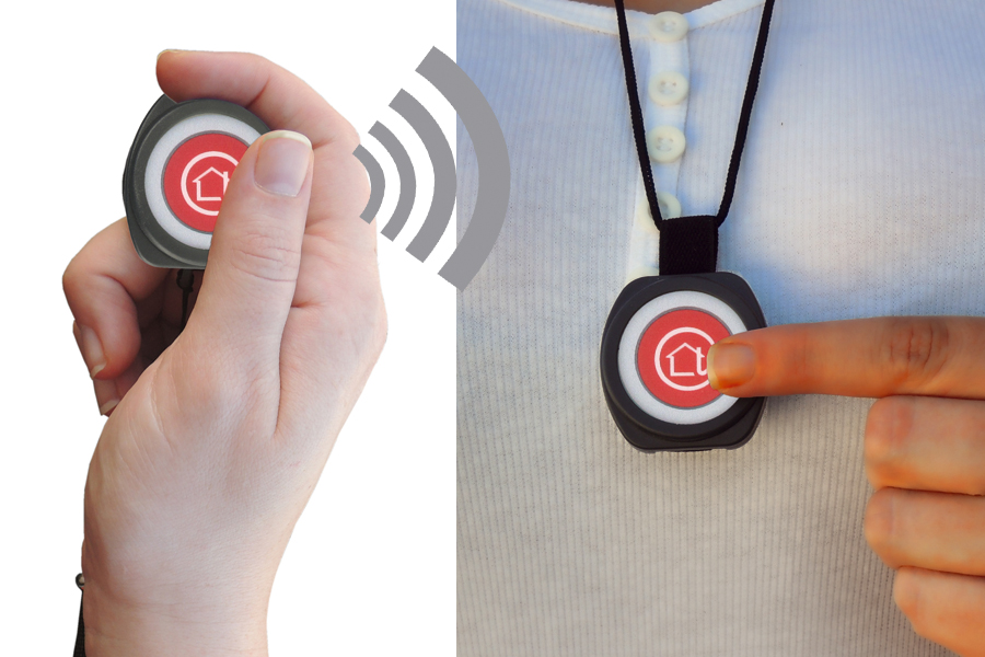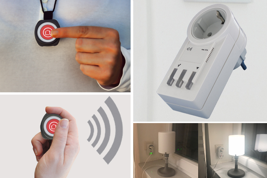- Der Rufknopf schaltet per Funk die Stehlampe im Wohnzimmer an. Der schwerhörige Lebenspartner bemerkt so, dass Hilfe benötigt wird.