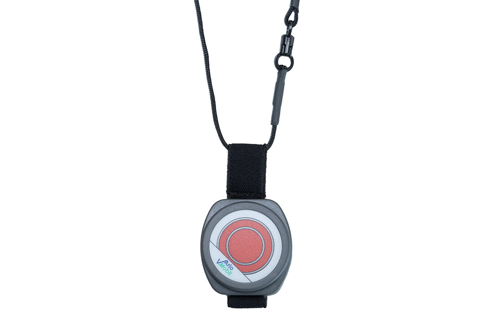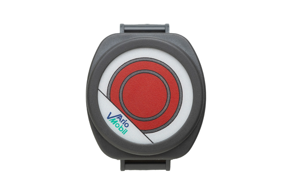 Wasserdichter und schwimmbadtauglicher Rufknopf. Der VarioMobil Plus kann wie eine Kette umgehangen oder am Arm, ähnlich einer Uhr getragen werden. Der Ruf wird durch Druck auf die rote Taste ausgelöst.