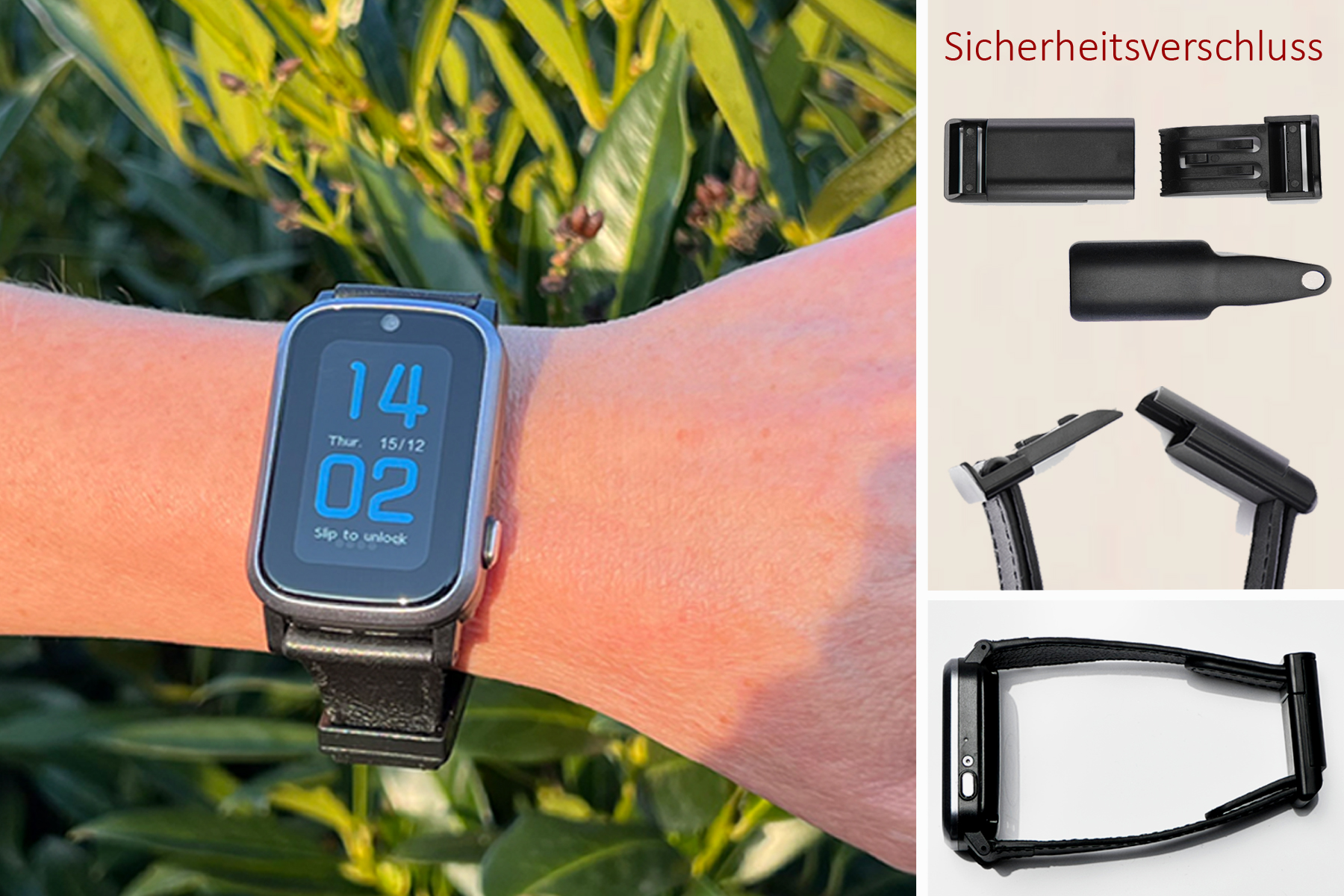 1. Tracker mit Sicherheits-Verschluss (nicht versehentlich abnehmbar - bei Demenz)