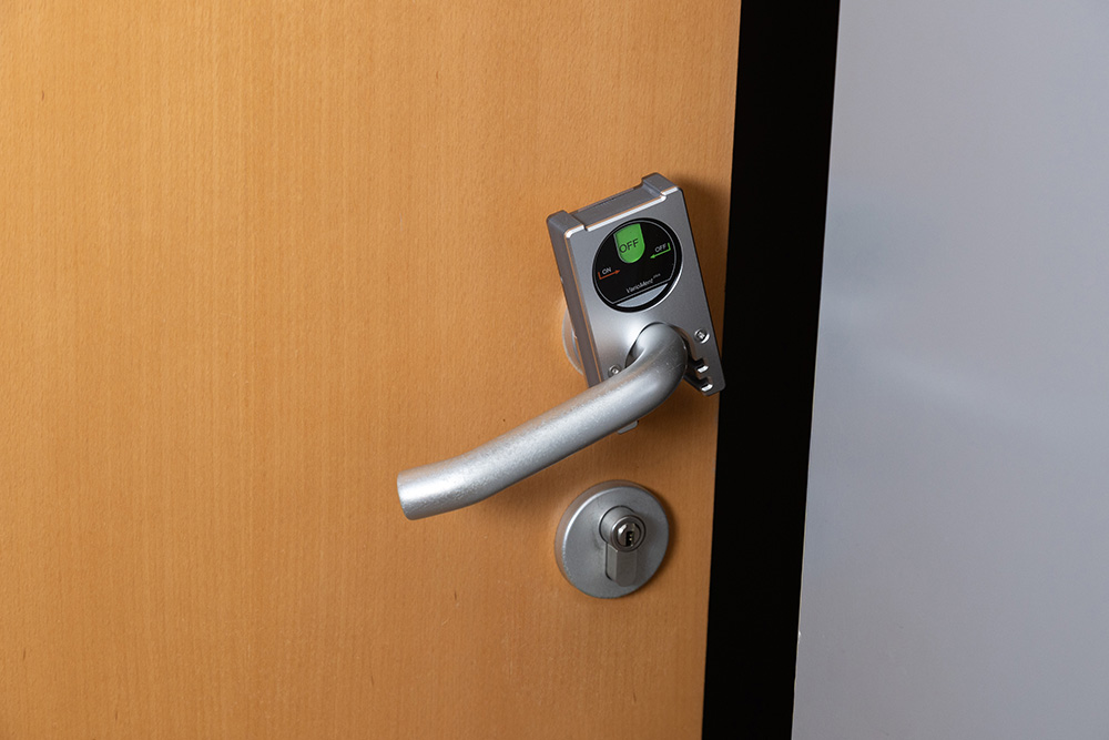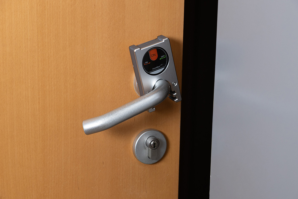 Der Lehmann Türwächter wird von außen an der zu überwachenden Türklinke befestigt und kann von innen weder manipuliert noch abgestellt werden. Damit ist zuverlässig die gewünschte Funktion sichergestellt. Von außen lässt sich der Türwächter bequem mittels eines Magnetschlüssels jederzeit aktivieren oder deaktivieren. Der Status wird optisch gut erkennbar angezeigt.