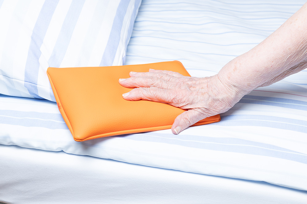 Sein Vorteil ist neben seiner großen Auslösefläche die universelle Anbringung. So kann es mittels Klettverschlusses am Bett befestigt werden, oder durch seine Kabelfreiheit auch direkt im Bett z. B. neben der Hand oder Wange etc. platziert werden.